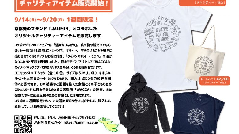 京都のチャリティ専門ファッションブランド「JAMMIN(ジャミン)」さんにお声かけをいただきウィメンズネット・こうべを支援対象としたオリジナルアイテムが販売されることになりました。